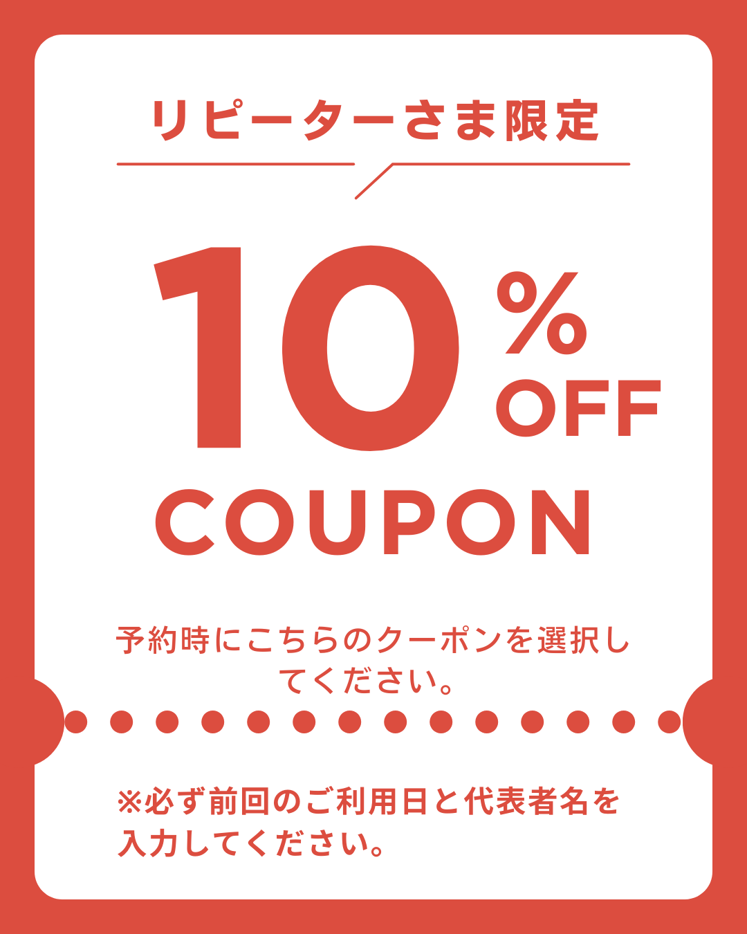 これまでは基本料金の10%をご予約後に手作業で計算しお知らせしておりましたが、今後は総額の10%とし、ご予約時にクーポンを選択いただく仕様へと変更いたしました!
